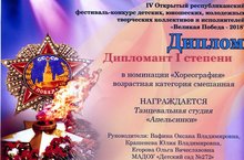 Танцевальный коллектив нашего детского сада "Апельсинки" принял участие в IV Открытом Республиканском фестивале-конкурсе детских, юношеских, молодежных, творческих коллективов и исполнителей «Великая Победа -2018" и был награжден дипломом I степени в номинации "Хореография". Спасибо большое музыкальным руководителям Крашеневой Юлие Владимировне и Егоровой Ольге Вячеславовне за хорошую подготовку. Поздравляем наших маленьких артистов и желаем новых высоких достижений!!!!