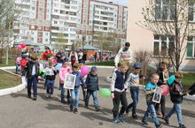 В честь празднования Великой Победы в нашем детском саду прошла акция "Бессмертный полк". Дети гордо несли портреты своих прадедушек и прабабушек, по окончанию "шествия" в небо были запущены шары в Память о Защитниках Отечества!