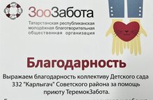 Татарстанская республиканская молодежная благотворительная общественная организация "Зоозабота" благодарит родителей и сотрудников детского сада за помощь приюту "Теремок Забота". Спасибо каждому за активность и внимание к животному миру