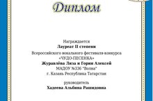 Поздравляем воспитанников нашего детского сада, лауреатов Всеросийского вокального фестиваля - конкурса "ЧУДО - ПЕСЕНКА" Журавлёву Лизу и Горина Алексея под руководством нашего музыкального руководителя Хадеевой Альбины Рашидовны.