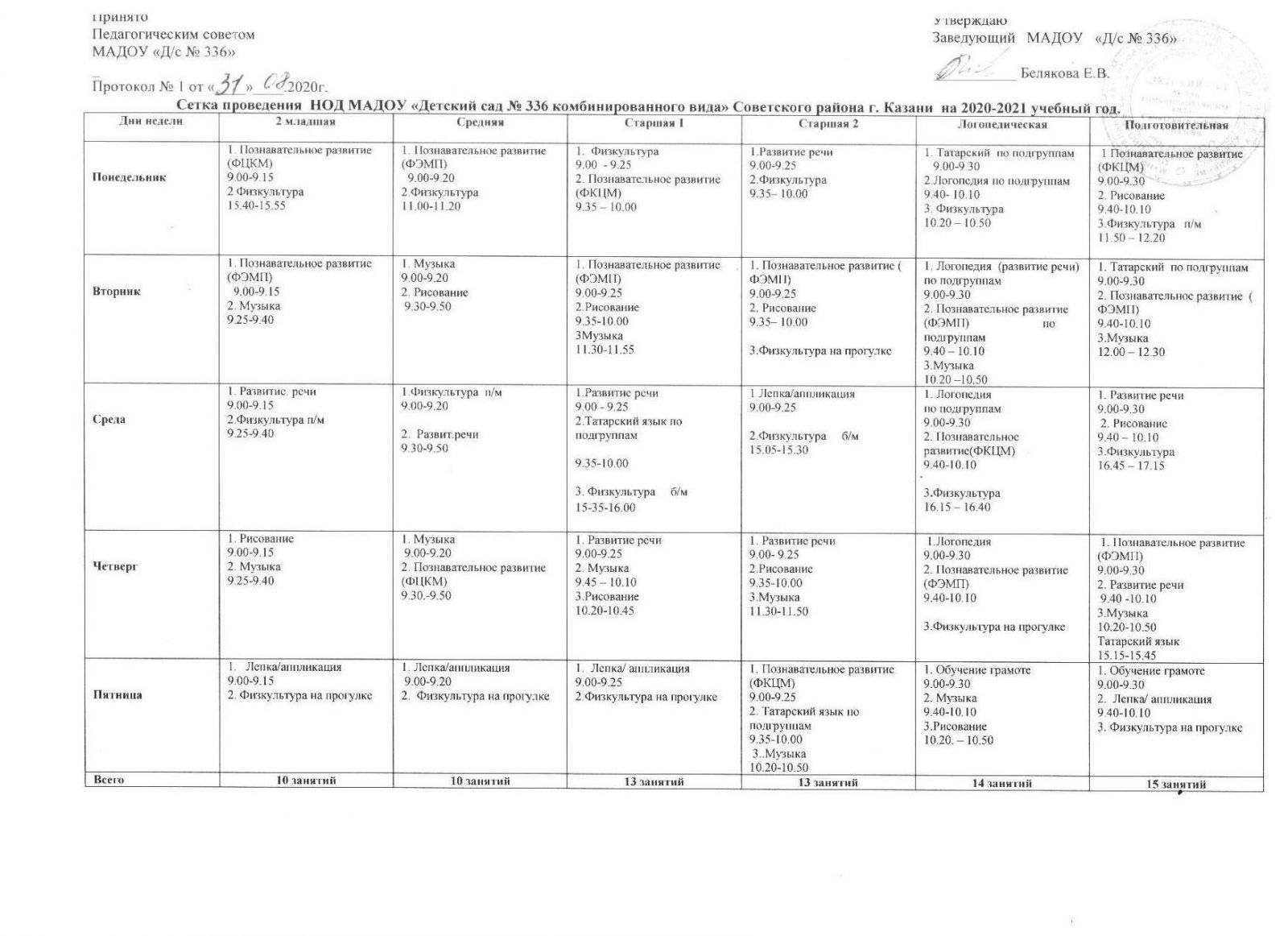 Расписание ОД МАДОУ «Детский сад № 336 комбинированного вида» Советского района г. Казани на 2020-2021 учебный год