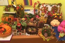 В создании поделок для выставкив"Волшебный сундучок осени", в нашем детском саду, учавствовали семьи воспитанников нашего детского сада.Родители вместе со своими детьми заготовливали природный материал,фантазировали и делали оригинальные,необычные и красивые поделки.В своих работах участники использовали различные природные материалы:тыкву,калину,рябину,шишки,листики,цветы и веточки,разнообразные овощи и фрукты.