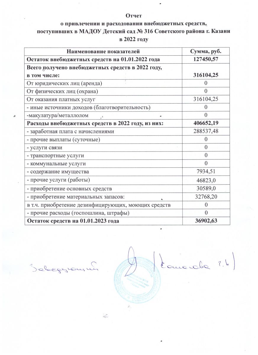 ОТЧЁТ О ПРИВЛЕЧЕНИИ И РАСХОДОВАНИИ ВНЕБЮДЖЕТНЫХ СРЕДСТВ ЗА 2022 ГОД-МАДОУ 316.