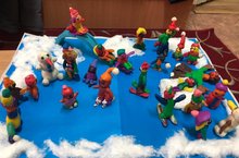 В целях привлечения детей к времени года Зима, к активному отдыху, зимним забавам и играм, созданию замечательного зимнего настроения, развития у детей фантазии, желания заниматься творчеством и воспитания любви к творчеству, красоте, искусству в подготовительной группе прошло тематическое занятие «Зимние забавы». Дети с большим интересом лепили фигурки лыжников, снеговиков и детей со снежками из пластилина. Коллективная работа получилась творчески интересная и неповторимая! Молодцы!