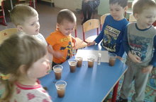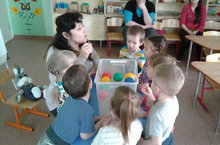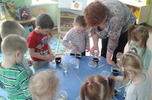 Сегодня занятие с применением эксперимента прошло в самой маленькой ясельной группе №7. Занятие провела Никитина Н.М. Дети узнали что легче, что тяжелее. (Вата или камень). Почему мячик в воде не тонет, а камень тонет. Закрепляли цвета на татарском языке.