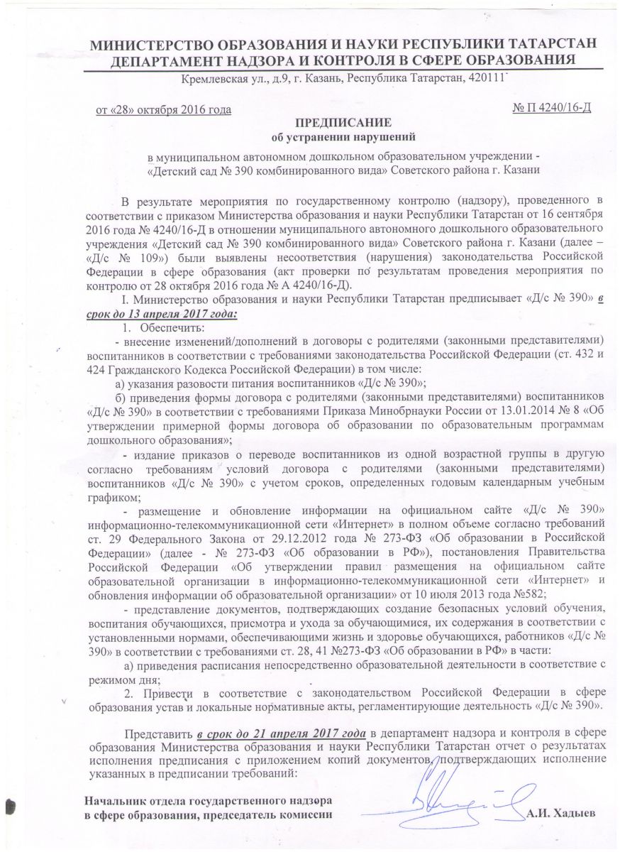 Предписания надзорных органов/Тикшерү органнары күрсәтмәләре