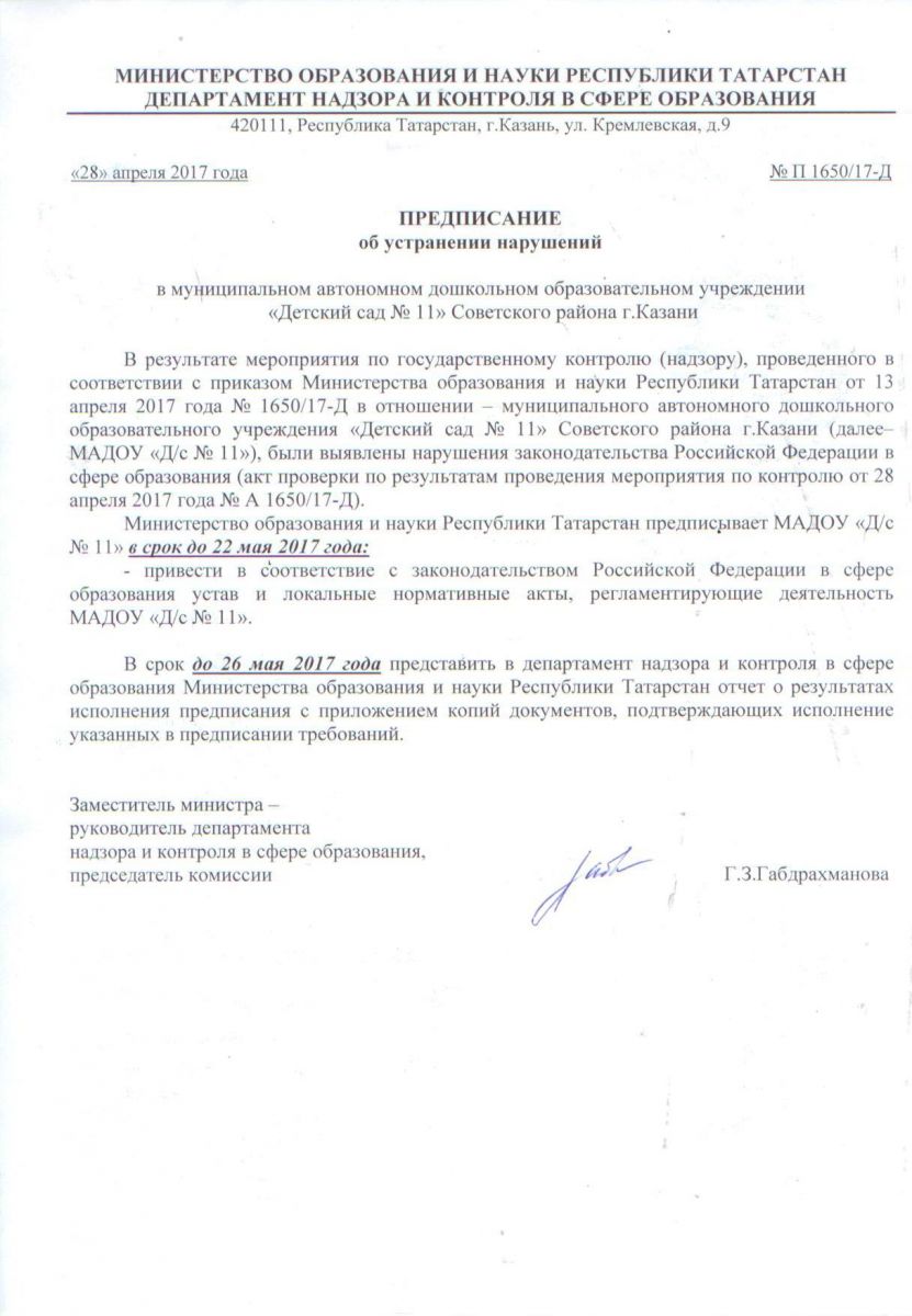 Предписание об устранении нарушений в области образования МАДОУ Детский сад №11 2017 г