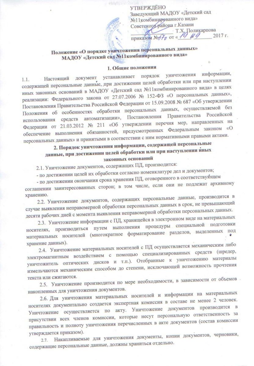 Порядок уничтожения и обезличивания персональных данных в МАДОУ Детский сад №11
