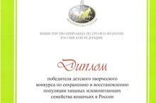 Аникина Кира, ученица 2А класса, стала победителем всероссийского детского творческого конкурса по сохранению и восстановлению популяции хищных млекопитающих семейства кошачьих в России, проводимого в рамках Всероссийского экологического детского фестиваля. Этот фестиваль проводился в соответствии с приказом главы Министерства природных ресурсов РФ С.Донского в преддверии Года экологии и Года особо охраняемых природных территорий 2017 г. Главная цель фестиваля пропаганда идеи сохранения и бережного отношения к природе. Поздравляем Киру с таким замечательным результатом!