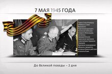 7 мая 1945 г. – вблизи французского г. Реймса в штаб-квартире генерала Д. Эйзенхауэра подписан акт о капитуляции Германии. В присутствии французского генерала Сэвэ его подписали: от Германии – генерал-полковник А. Йодль, от верховного главнокомандования Союзными экспедиционными силами – генерал-лейтенант Б. Смит и советский генерал-майор И.А. Суслопаров. Акт определял окончание активных боевых действий 8 мая в 23:01 по центральноевропейскому времени. Это был предварительный протокол о капитуляции.