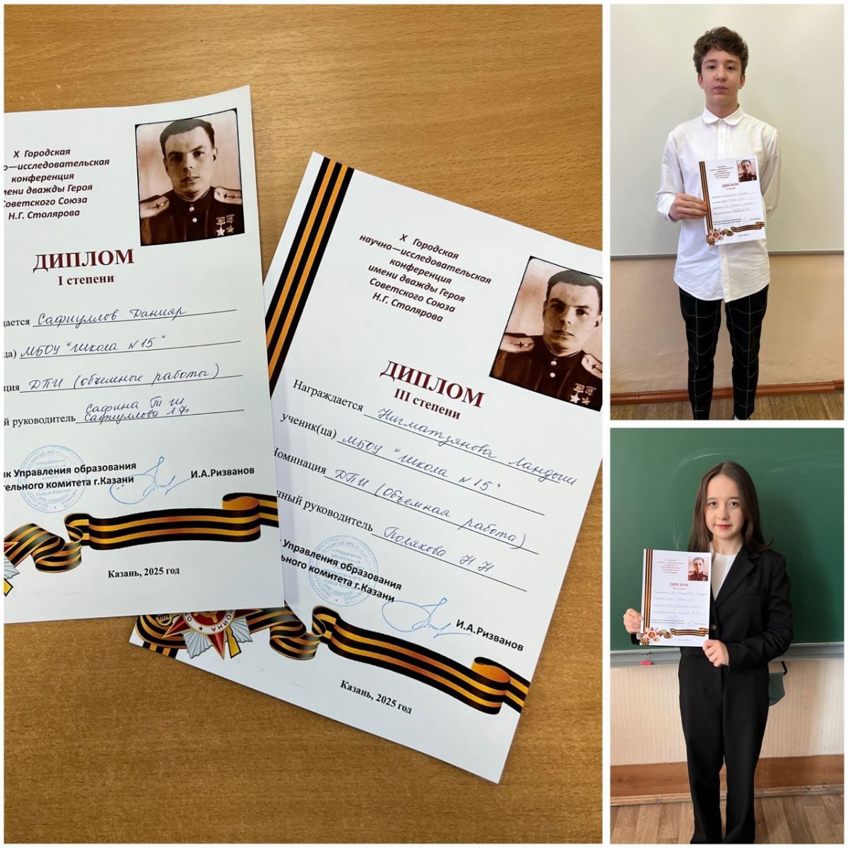 26 апреля наши ученики Сафиуллов Данияр (7А), Нигматзянова Ландыш (8В) успешно выступили на X городской научно -исследовательской конференции "Мужество останется в веках "Наши учащиеся награждены дипломами I и III степени.