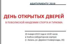 26 января 2019 года в 13:00 часов Академия проводит День открытых дверей. Мероприятие пройдет в Учебно-лабораторном корпусе по адресу: г. Казань, ул. Деревня Универсиады, д. 35. В программе: презентация академии, работа площадок по профилям подготовки, экскурсия в студенческие общежития.