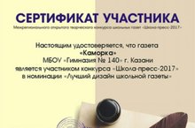 Школьный пресс-центр гимназии №140 принял участие в творческом конкурсе школьных газет где, наша газета «Каморка» приняла участие и была номинированная « Лучший дизайн школьной газеты»