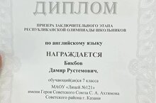 Поздравляем Бикбова Дамира, ученика 7В класса, ставшего призером заключительного этапа республиканской олимпиады школьников по английскому языку (учитель Андрущенко М.А.)