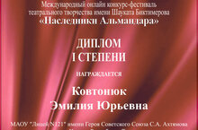 Поздравляем Ковтонюк Эмилию, ученицу 6 Д класса, получившую Диплом I степени на Международным конкурсе-фестивале театрального творчества