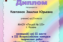 Ученица 5Д класса, Ковтонюк Эмилия, стала обладательницей диплома II степени в III Всероссийском конкурсе творческих работ "Сказки, которые я люблю".