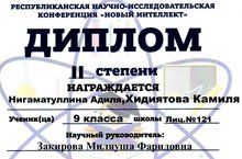Учащихся 9е класса Нигаматуллина Адиля и Хидиятова Камиля под руководством учителя математики Закировой Миляуши Фаридовны выступили на республиканской научно-исследовательской конференции "Новый Интеллект" и стали обладателями диплома II степени.