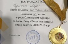 Кодинцева Дарья, ученица 5Д класса заняла II место в республиканском турнире по баскетболу «Весенняя капель».