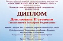 В рамках проектной деятельности и распространения педагогического опыта заместитель директора по воспитательной работе Гильманова Гульфия Радиковна приняла участие во Всероссийском конкурсе педагогического мастерства «Воспитание искусством – 2021» и в номинации «Лучший педагогический проект» стала дипломантом II степени.