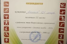 Хоккейная команда «Атлант» Школы на Космонавтов в районном этапе Всероссийских соревнований юных хоккеистов «Золотая шайба – 2020» заняла почётное 3 место под руководством тренера Закиева Язкара Хамитовича.