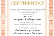Поздравляем учителя математики Цветкову марину Альбертовну, которая была награждена медалью «За вклад в развитие образования в России»