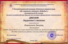 Ученица 8 Б класса Эмилия Ковтонюк (рук. Валиуллина Р.Х.)награждена Дипломом Лауреата I степени V Республиканского конкурса детского творчества «Не меркнет летопись Победы!»,