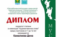 Камалиева Дина ученица 5В класса (рук: Миннуллина А.И) приняла участие в Республиканском патриотическом конкурсе.