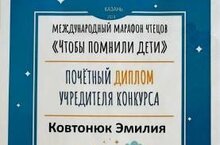 Ученица 8 Б кл. Эмилия Ковтонюк вышла в финальный очный тур Международного марафона чтецов «Чтобы помнили дети» и получила Почетный диплом учредителя конкурса.