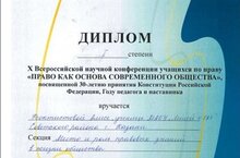 Поздравляем Феоктистову Алису ученицу 9 "Б" класса занявшую 1 место на X Всероссийской научной конференции учащихся по праву «Право как основа современного общества».