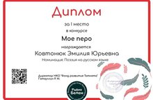 Поздравляем ученицу 7Д класса Эмилия Ковтонюк с отличными результатами и победой в конкурсе юных поэтов «Музыка из слов», проводимым МБУК «Музейный комплекс Казани».