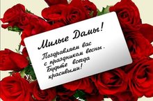 Уважаемые женщины, милые коллеги, поздравляем вас с 8 Марта и желаем мира, благополучия, везения, уверенности, бодрости, настойчивости и побед! Пусть каждый день для женского сердца дарит радость и любовь, пусть и дома, и на работе, и в любом направлении вас ждет большой успех!