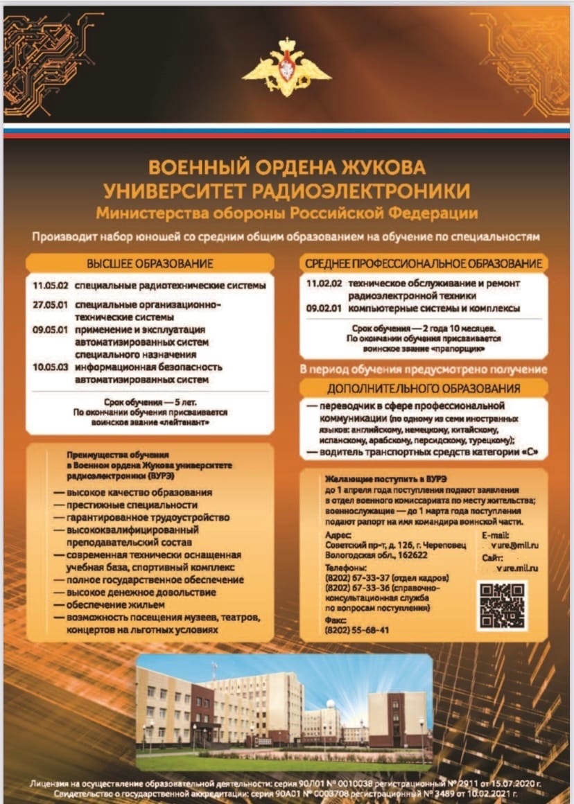 ДЕНЬ ОТКРЫТЫХ ДВЕРЕЙ Военный ордена Жукова университет радиоэлектроники 29 октября 2022 г. в 10.00 часов приглашает юношей и их родителей на День открытых дверей. Военный университет радиоэлектроники – уникальная образовательная организация Министерства обороны Российской Федерации, которая на протяжении долгих лет готовит элитные офицерские кадры – главный стержень Вооруженных Сил России. Будущие кандидаты на поступление и их родители смогут познакомиться с учебно-материальной базой военного университета, условиями проживания, питания, особенностями службы и быта курсантов, задать командованию вуза интересующие их вопросы, стать участниками презентации по специальностям подготовки вуза.Гостям военного университета разъяснят порядок и особенности организации приема в вуз, прохождения медицинского освидетельствования кандидатов на поступление, определения их профессиональной пригодности, оценки уровня физической подготовленности. Университет осуществляет подготовку специалистов по программам высшего образования и среднего профессионального образования для Министерства обороны Российской Федерации и других федеральных органов исполнительной власти. С 2016 года ведется подготовка кадров в интересах Национального центра управления обороной Российской Федерации. https://chvviure.mil.ru/Media