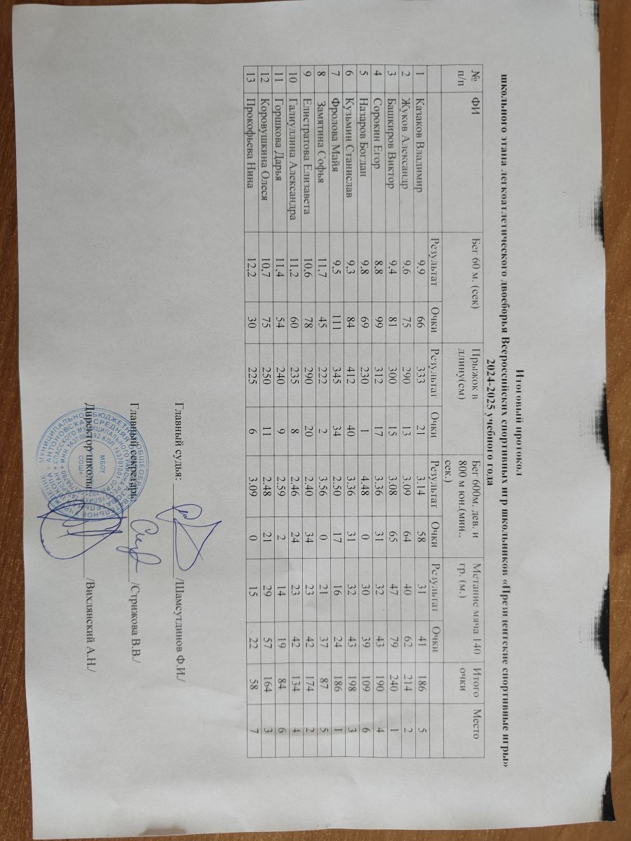 Протокол 1. "Президенские спортивные игры 2024- 2025"(школьный этап)