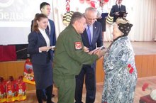 По живому коридору ветераны поднялись в ярко украшенный актовый зал, где их с аплодисментами встретили учащиеся школы, глава Спасского муниципального района Камиль Асгатович Нугаев, начальник военного комиссариата Ильхам Ильдусович Мидхатов, работники социальной защиты, которые от души, от всего сердца поздравили собравшихся гостей с наступающим праздником 70 - летием великой Победы и вручили каждому ветерану юбилейную медаль и памятный подарок.