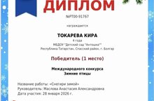Наша воспитанница средней группы Токарева Кира получила диплом за 1 место Международного конкурса "Зимние птицы". Педагог Маслова Анастасия Александровна.