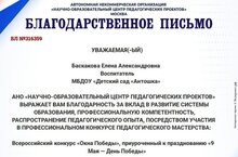 Наш педагог Баскакова Елена Александровна получила Благодарственное письмо.