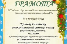 Наши воспитанники Козлова Елизавета и Пронягина Екатерина получили грамоты за участие "Альтернативная новогодняя ель". Педагог Козлова Оксана Сергеевна. Козлова Елизавета заняла второе почётное место.