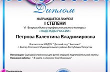 Наш педагог Петрова Валентина Владимировна получила диплом 1степени. За публикацию сценария.