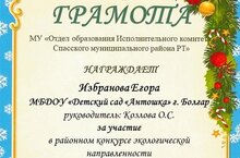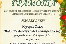 Наши воспитанники подготовительной группы Гараев Идрис, Юрков Олег, Мишенькина Есения получили грамоты за участие в конкурсе "Альтернативная новогодняя ель". Педагог Сабирова Алсу Исмагилловна.