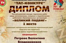 Наш педагог Петрова Валентина Владимировна получила диплом за 1 место за участие в Республиканском конкурсе за публикацию конспекта сценария ко Дню Победы.