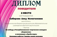 Наш педагог Сабирова Алсу Исмагилловна получила диплом 2 место! В Республиканском творческом конкурсе " Вернисаж"