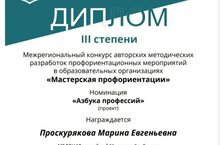 Наш педагог Проскурякова Марина Евгеньевна получила диплом III степени в Межрегиональном конкурсе авторских методических разработок профориентационных мероприятий в образовательных организациях " Мастерская профориентации".Номинация "Азбука Профессий". Поздравляем!!!!