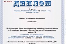Наш педагог Петрова Валентина Владимировна получила диплом 1 степени по итогам Всероссийского конкурса профессионального педагогического конкурса в номинации " Волшебница Осень" конспект занятия.