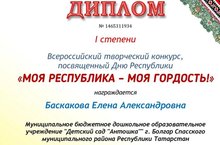 Наш педагог Баскакова Елена Александровна приняла участие во Всероссийском творческом конкурсе ко Дню Республики " Моя Ресублика-моя гордость!" и заняла первое почётное место!!! Диплом первой степени. Поздравляем!!! Молодец!!!