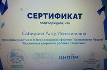 Наш педагог Сабирова Алсу Исмагилловна приняла участие в III Всероссийском форуме " Воспитатели России ": " Воспитаем здорого ребёнка. Поволжье" и была награждена сертификатом участника.