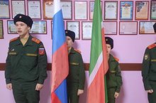 Сегодня на Торжественной линейке Государственные гимны под государственными флагами РФ и РТ пели кадеты 7 класса Лисов С. и Мартынов М.