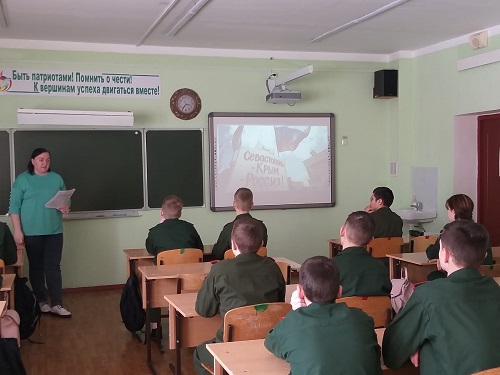 Опубликовано: 18.03.2022Историческому событию -дню Воссоединения Крыма и России были посвящены военно-спортивная игра "Растим патриотами" где кадеты продемонстрировали навыки военно- прикладной подготовки. Состоялись тематические классные часы "Крымская Весна" Кадеты каждого приняли участие в видео-экскурсии "Крым 2014-2022"
