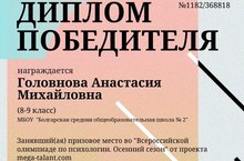 Учащиеся 9 и 11 классов Головнова Анастасия и Марянина Дина под руководством педагога-психолога Артюшиной А.Ю. приняли участие в дистанционных олимпиадах по психологии от Центра развития талантов «Мега-Талант». 25.11.2017