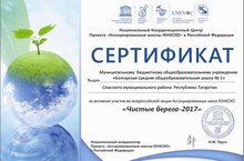 Школа награждена сертификатом за активное участие во всероссийской акции Ассоциированных школ ЮНЕСКО «Чистые берега 2017» 27.06.2017