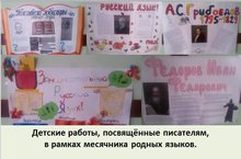 В фойе 2 этажа в школе организовали выставку детских работ, посвящённых писателям, в рамках месячника родных языков.